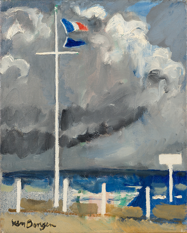 Flying the French flag, the tall mast—forming a cross against the restless sky— serves to heighten the gravity of the composition.