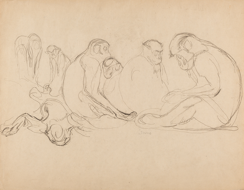 Première esquisse pour une illustration des Paradis Terrestres de Colette (Edition Gonin et Cie, 1932), à rapprocher de l'illustration figurant en pleine page, p.100 (Singes IX).
